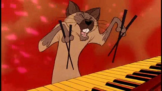 Further constructions of the Orient and Oriental characters are made in The Aristocats and Fantasia. In Fantasia, The Nutcracker Suite by Pytor Ilyich Tchikovsky features a “Chinese” dance and in the accompanying animation, seven pink mushrooms dance around to the fast-paced, string-heavy music. The tops of the mushrooms resemble dǒulìs and they appear to shuffle about in floor-length hanfu garments with their ‘arms’ folded in front of them, repeatedly bowing to one another. Though they technically have no faces, straight lines are drawn on the fronts of the mushrooms that are direct depictions of the all-to-common squinky-eyed portrayals of East Asians in the Golden Era of Hollywood. Another musical number in The Aristocats contains a Siamese cat (named Shun Gon the Chinese Cat) using a symbol as a dǒulì and later playing the piano with chopsticks while screeching in a Chinese accent, “Shanghai, Hong Kong, Egg Foo Yong! Fortune cookie always wrong! Hya ha ha!” (The Aristocats 1970).