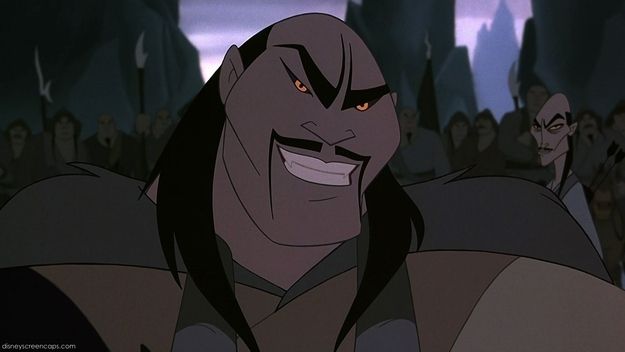 Mulan, Aladdin, and Tangled are also significantly similar in their portrayals of their villains. All three of their films’ main antagonists are introduced in the opening scenes, even before we meet the heroes. In Mulan, Shan Yu is the leader of the Hun army and Mongolian invaders of China whom Mulan eventually goes to war against. The depiction of Shan Yu and the rest of the Huns is not an attractive one, with Shan Yu himself being a hulking and muscular figure with piercing yellow eyes, grey skin, a sharp nose, prominent forehead, fingernails sharpened into claws, and always accompanied by a menacing black falcon. His character is portrayed using physical stereotypes of Mongolians and meant to induce the imagery of an ‘exotic’, Oriental man who is, at his core, evil. Aladdin’s main villain is Jafar, a narcissistic, tyrannical psychopath who revels in the torturing of others, sexually harrasses Princess Jasmine, and enforces misogynistic behavior (“Your speechlessness is a fine quality in a wife”) (Aladdin 1992). Jafar is the greedy, terroristic Arab man in Middle Eastern stereotypes. This is further stressed in the dichotomy of appearance with the film’s other characters. Though the story is meant to take place in Arabia and the characters (sans the Genie) are meant to be Middle Eastern, the protagonists instead have very Western features, with big eyes and light skin, while the villain is portrayed as more similar to the physical appearance of Middle Easterners and heavily playing into Arab stereotypes.